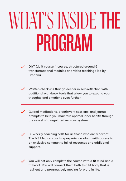 With a unique integration of movement, mindset, and medicine; The M3 Method offers a comprehensive system that brings light to both your physical and mental needs. This course provides you with the tools and support to overcome your toughest challenges, break free from limiting beliefs, and show you your highest potential. By committing to this transformative process, you will not only achieve a stronger, healthier body but also cultivate a resilient, empowered mind, leading you to a life filled with vitality, purpose, and joy.